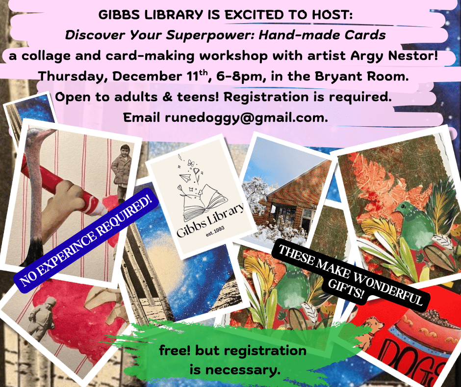 We are excited about this FREE collage and card-making workshop with celebrated artist and award-winning teacher Argy Nestor. The workshop, Discover Your Superpower: Hand-made Cards, will be held in the Bryant Room on Thursday, December 11th, from 6-8pm. Registration is required. Email Delphine at runedoggy@gmail.com to register. Open to adults & teens.