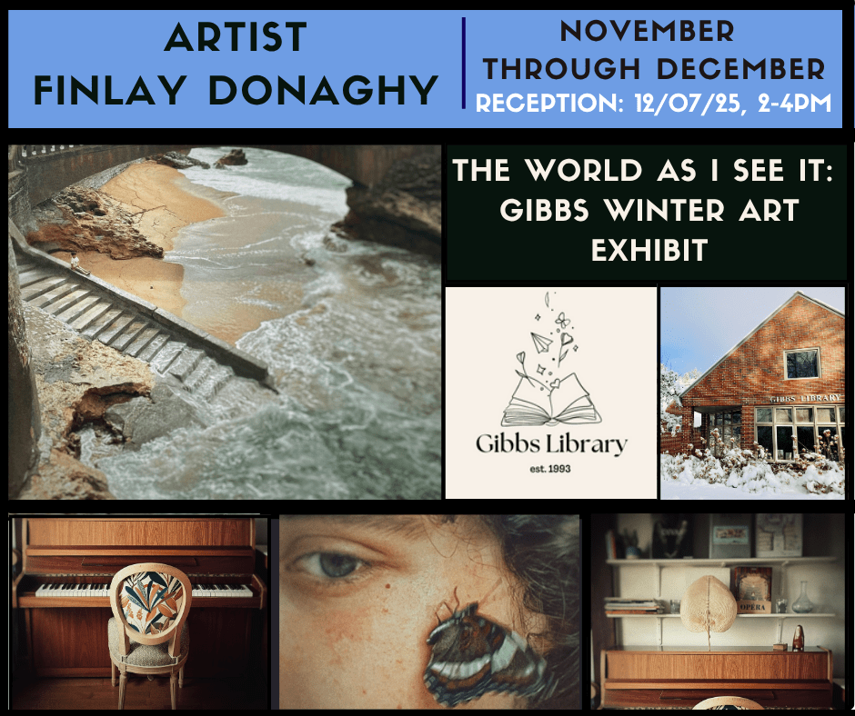 Art Exhibit / Featured Artists: Gibbs Library is proud to present our winter art exhibit: The World as I See It, photography by Finlay Donaghy. These stunning and evocative pieces will be featured in our gallery November through December. A reception will be held Sunday, December 7th, from 2-4pm. Light refreshments will be provided.