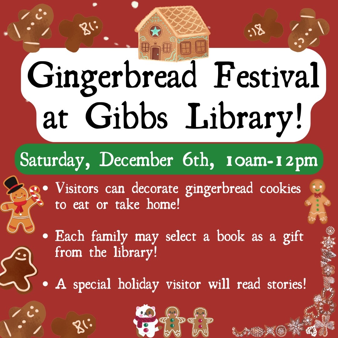 Gibbs Gingerbread Festival takes place on December 6th from 10am to 12pm in the Bryant Room. Come frost (and eat!) gingerbread cookies, listen to stories from a special holiday visitor, and choose a new book as a free gift from Gibbs! (A free book for every family.) Join in the fun and get into the festive winter spirit at Gibbs!