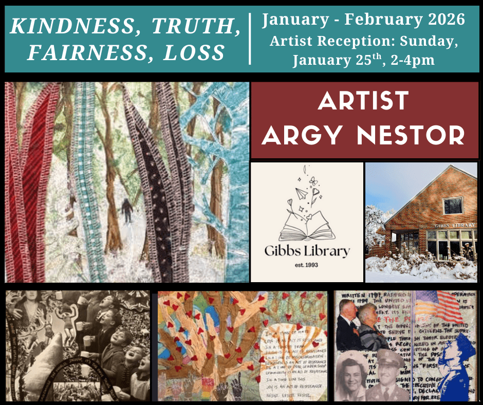 Art Exhibit / Featured Artists: Gibbs Library is proud to present our late winter art exhibit: Kindness, Truth, Fairness, Loss collage artwork by Argy Nestor. These evocative pieces will be featured in our gallery January through February. A reception will be held Sunday, January 25th, from 2-4pm. Light refreshments will be provided.